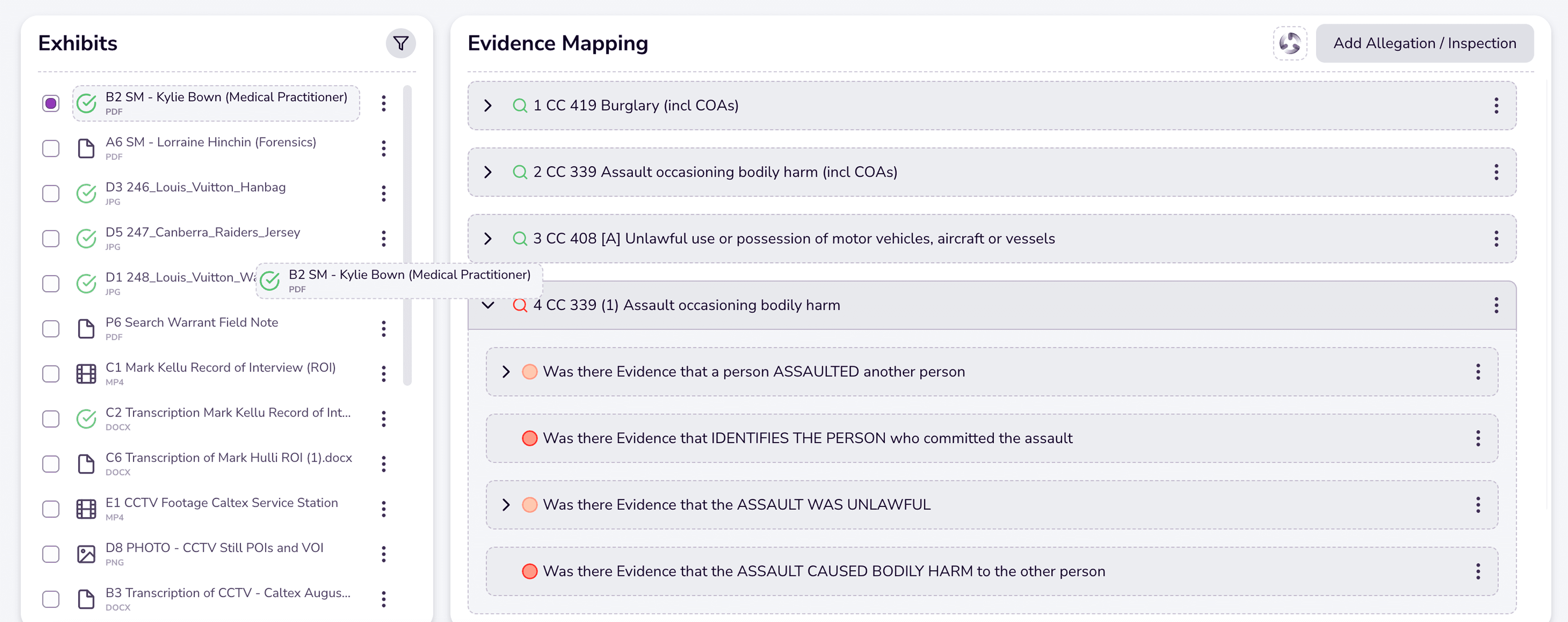 Link exhibits such as documents, interviews and photos directly to the allegation it supports.